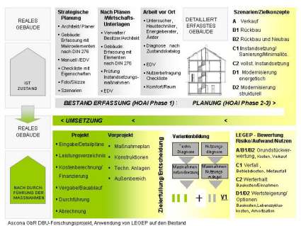 Erreicht werden soll eine integrale Betrachtungsweise des Bestandes und der bestandsverbessernden Maßnahmen in bauüblicher Beschreibungssprache (Leistungskataloge, Bauelemente, DIN 276-Gliederung). Die Arbeitsmittel sollen deshalb für eine breite Anwendung vor allem in KMU`s (kleinere und mittlere Unternehmen) geeignet sein und durch die Integration in marktführende Kataloge und Programme sollen sie sich unter marktwirtschaftlichen Bedingungen zeitnah umsetzen lassen.