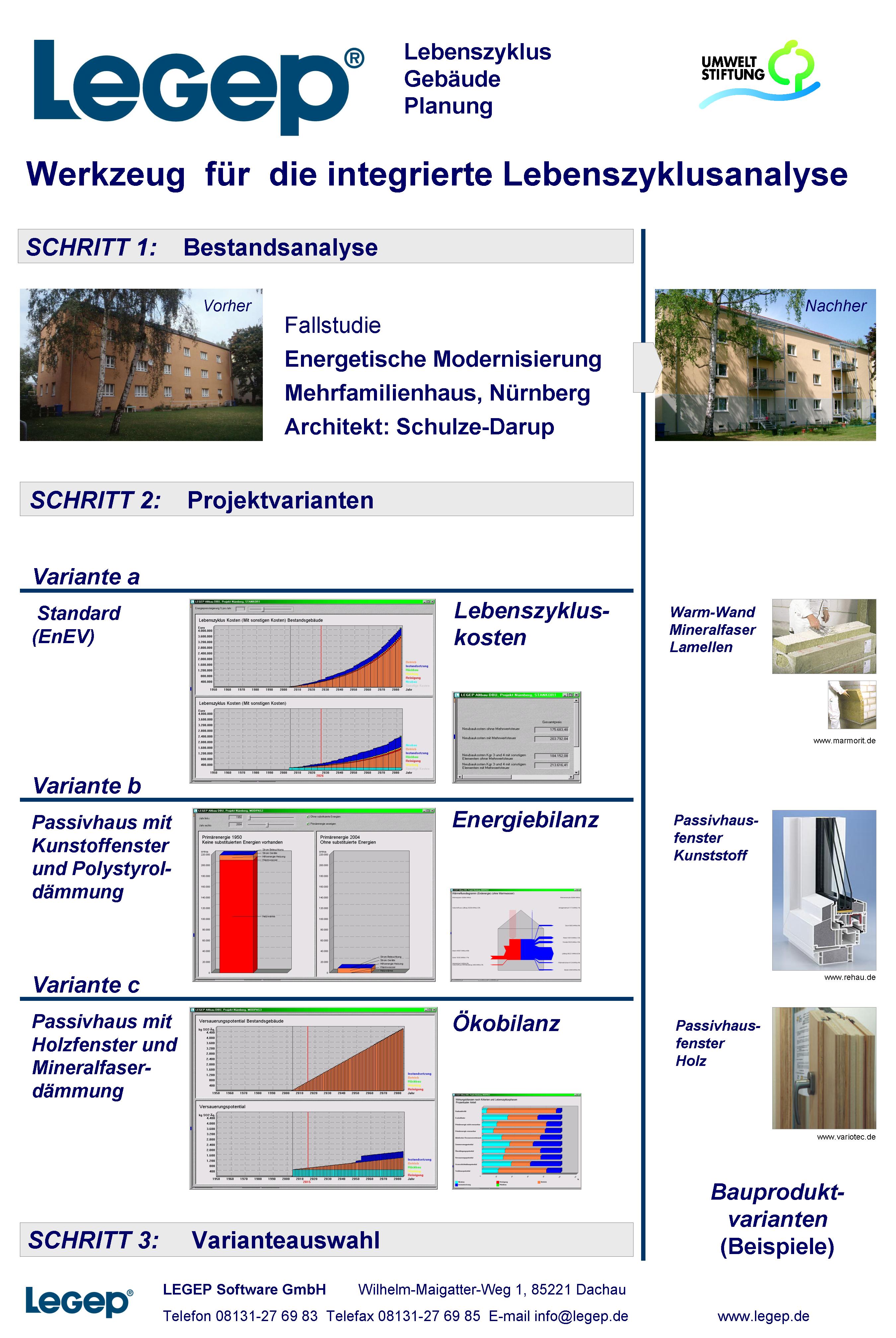 Während des Entwurfsprozesses arbeitet der Planer in seiner gewohnten Entwurfsumgebung mit Bauelementen (z.B. 1 m² Außenwand), die aus detaillierten Leistungspositionen bestehen und mit Kostendaten, bauphysikalischen Daten und Energie- und Stoffflußkoeffizienten hinterlegt sind. Diese Elemente sind mit ihren relevanten Daten Teil eines unabhängigen Bauteilkataloges (sirAdos-Baukatalog). Die verschiedenen LEGEP- Anwendungsprogramme arbeiten mit demselben Basisdatensatz. Die dokumentierten Projektdaten können mit Referenzdaten anderer Projekte verglichen werden. Umfangreiche Berechnungs- und Bewertungsdokumente und Visualisierungsgrafiken lassen sich zu einer Hauskate mit Gebäudepass zusammenstellen. Nach Empfehlung des BMVBW und der Bundesarchitektenkammer (BAK) umfassen die Dokumente sowohl den Bauprozess als auch die zukünftige Nutzungsphase des Gebäudes.
